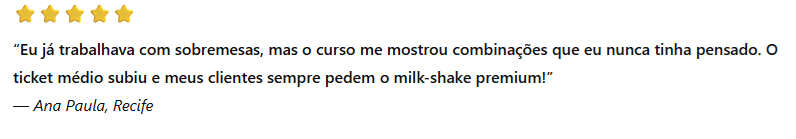Você aprende técnicas simples que deixam qualquer milk-shake com visual de loja gourmet. Mesmo sendo iniciante, você entrega algo tão bonito e cremoso bem profissional.